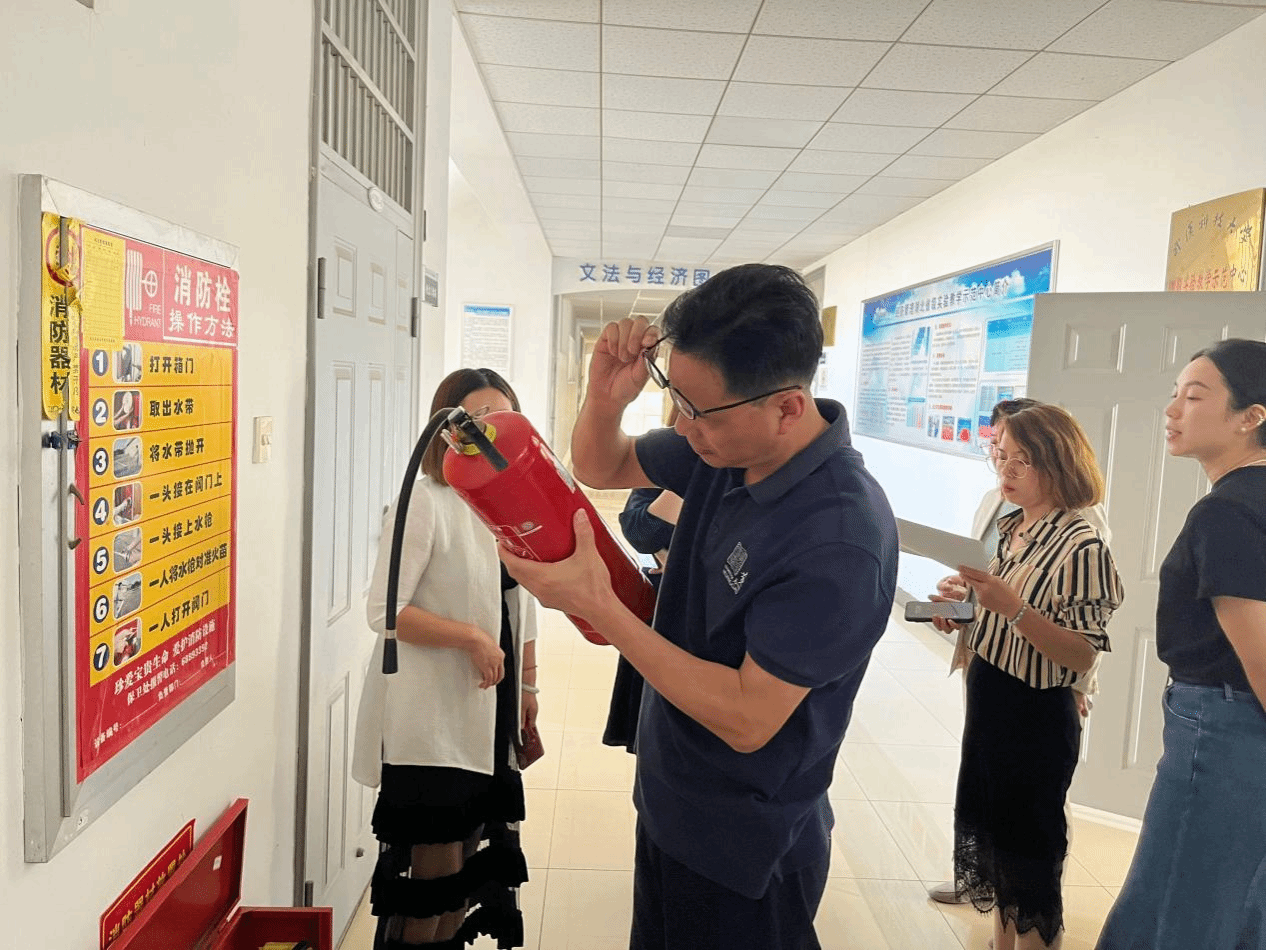 学院领导一行先后对各楼层楼道、实验室、图书馆、模拟法庭等重点场所进行了实地查看,检查了消防设施设备、安全责任人、消防安全管理等实际情况,针对存在的消防安全隐患和问题,提出了整改意见和要求。其中学院领导一行重点检查了消防设备的有效期限,院长袁年兴、行政副院长赵厚成还现场亲自示范如何正确的使用灭火器。