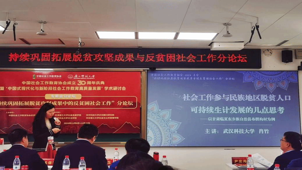 MSW研究生王一杰、刘田林做了《大社会工作背景下社工机构和社会工作服务的发展趋势探析》主题发言。肖竹老师在“持续巩固拓展脱贫攻坚成果中的反贫困社会工作”分论坛做了《社会工作参与民族地区脱贫人口可持续生计发展的几点思考》主题发言。汪宁宁老师在“中国式现代化背景下儿童保护与发展的理论与实践”分论坛做了《城乡迁移与教育获得: 效应、机制及其异质性》的发言主题。8X8X