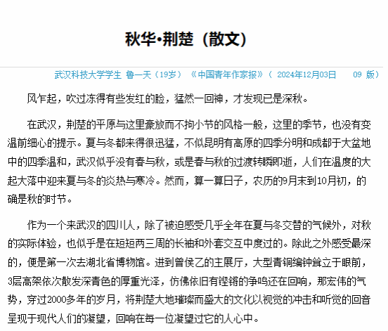 2023级法学专业本科生鲁一天在《中国青年作家报》上发表散文作品《秋华·荆楚》,受到了广泛关注。该作品以武汉的秋天为背景,融合荆楚文化元素,展现了作者对这片土地深厚的情感和独特的文化理解。