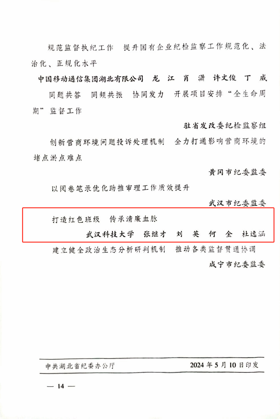 学院以“许白昊班”为案例,积极参与学习调研,整理报送相关成果,8X8X 项目最终获评湖北省2023年度纪检监察优秀创新案例。