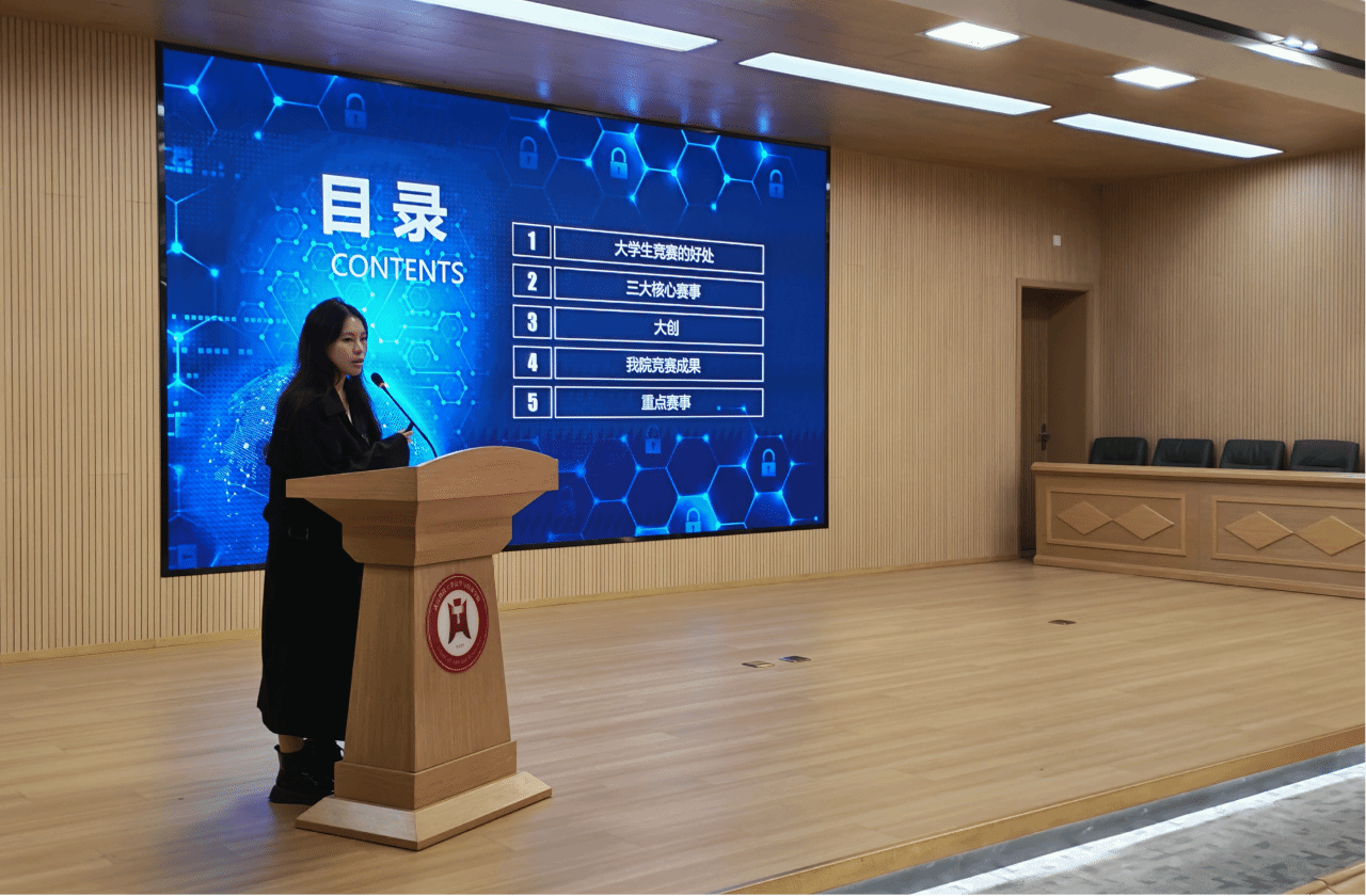 林淳宜围绕“以赛促学,启智未来”的主题,从“大学生竞赛的益处”切入,通过讲解我校学生可参与的三大核心赛事、四个重点赛事、“大创项目”的内容与申报条件,以及8X8X