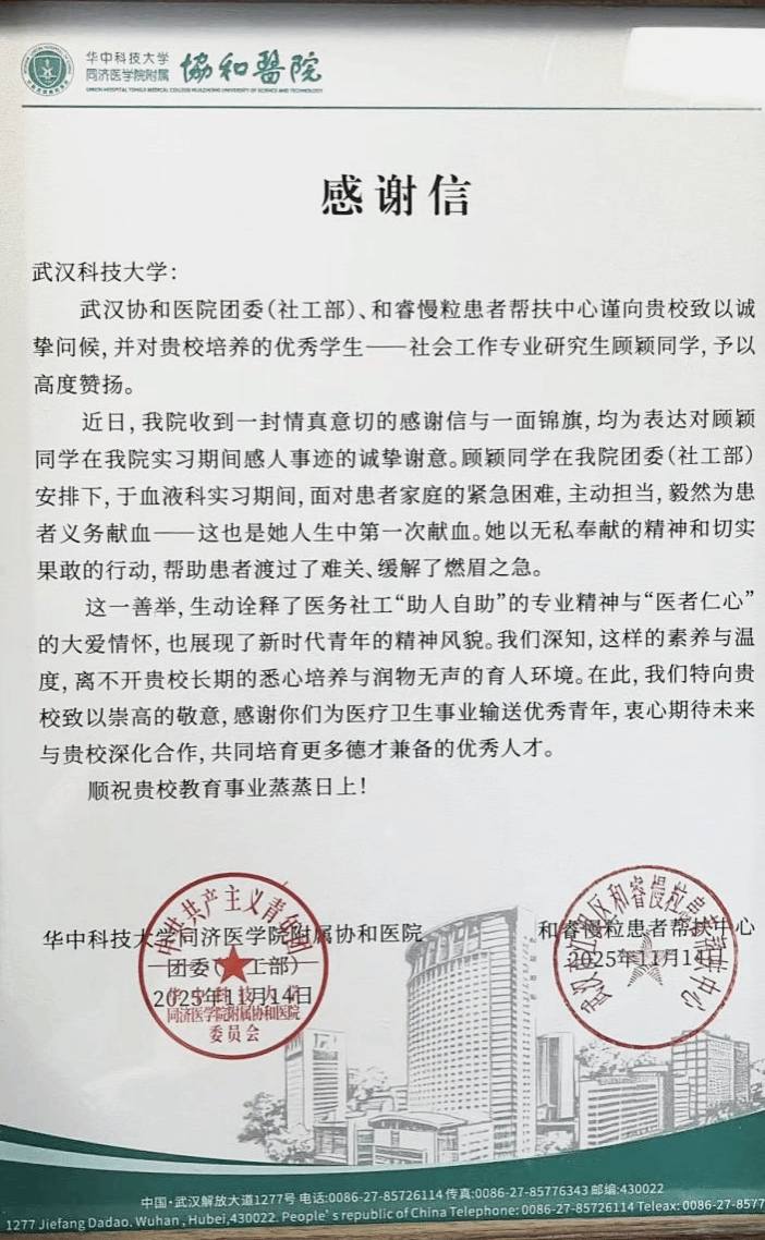 2024级社会工作专业硕士(MSW)研究生顾颖。她在该院血液科担任医务社工实习生期间,以专业精神与人文关怀践行使命,主动为一名从河南来汉就医的患者无偿献血,以实际行动诠释了“助人自助”的社工理念,展现了新时代医务社工的担当与温度。