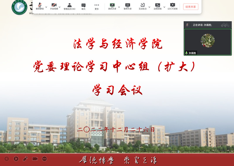 武科大网讯(通讯员胡诗绮)12月26日上午,学院党委在线上召开党委理论中心组(扩大)会议,邀请学校党委副书记孙国胜作党的二十大精神宣讲报告。学院全体领导班子成员、党委委员、党支部书记、系主任、中心主任、学生党员代表参加学习,学院党委书记张继才主持会议。
