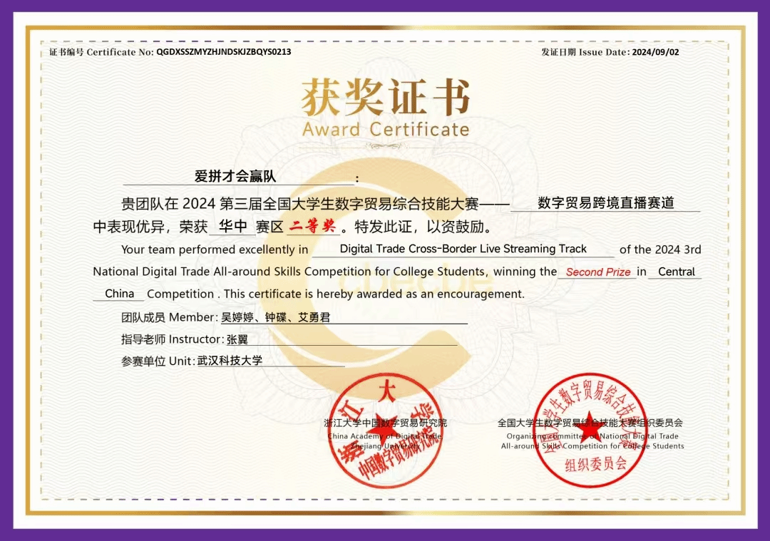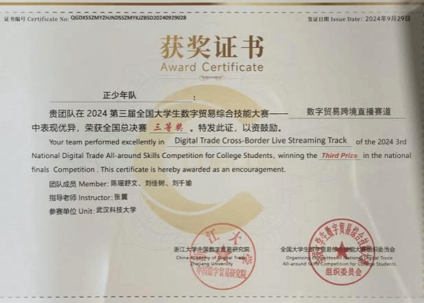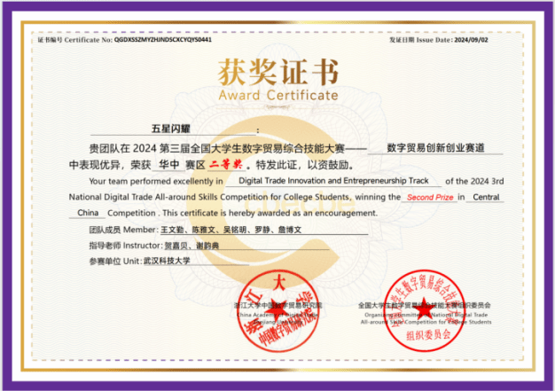 共有四支队伍获奖,两支队伍成功晋级总决赛。其中,由国贸2203班吴婷婷为队长的爱拼才会赢队(指导老师:张翼)荣获跨境直播赛道华中赛区二等奖;由研究生王文勤、陈雅文、吴铭明、罗静和投资2302班詹博文组成的五星闪耀队(指导老师:贺嘉贝、谢韵典)荣获数字贸易创新创业赛道华中赛区二等奖。