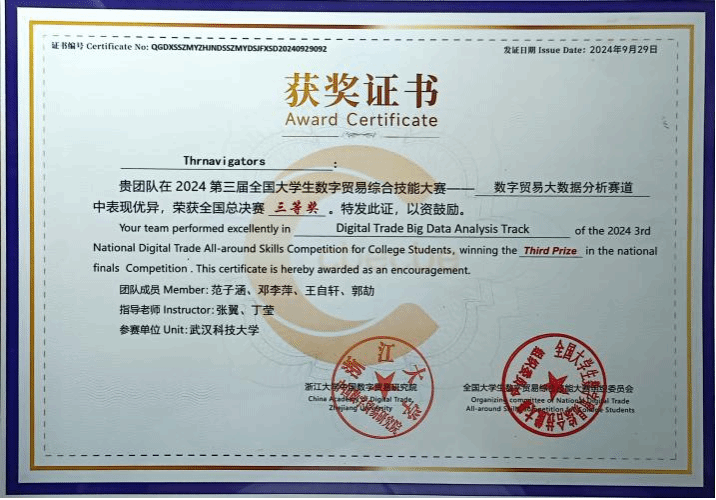 9月28日,在贺老师和丁老师的带领下,荣获区域赛一等奖的两支队伍分别前往比赛现场参加全国总决赛。数字贸易大数据分析赛道总决赛在杭州师范大学举行,经过现场路演和答辩两个环节,由国贸2202班范子涵和王自轩、投资2201班邓李萍组成的Thrnavigators队(指导老师:张翼、丁莹)获得全国三等奖。跨境电商直播赛道总决赛在浙江外国语学院举行,通过现场直播、评委打分等环节,由国贸2201班陈瑶舒文和刘千瑜组成的正少年队(指导老师:张翼)获得全国三等奖。两支队伍都展现出了法经学子的专业知识与能力,体现了努力拼搏和善于合作的良好精神风貌。
