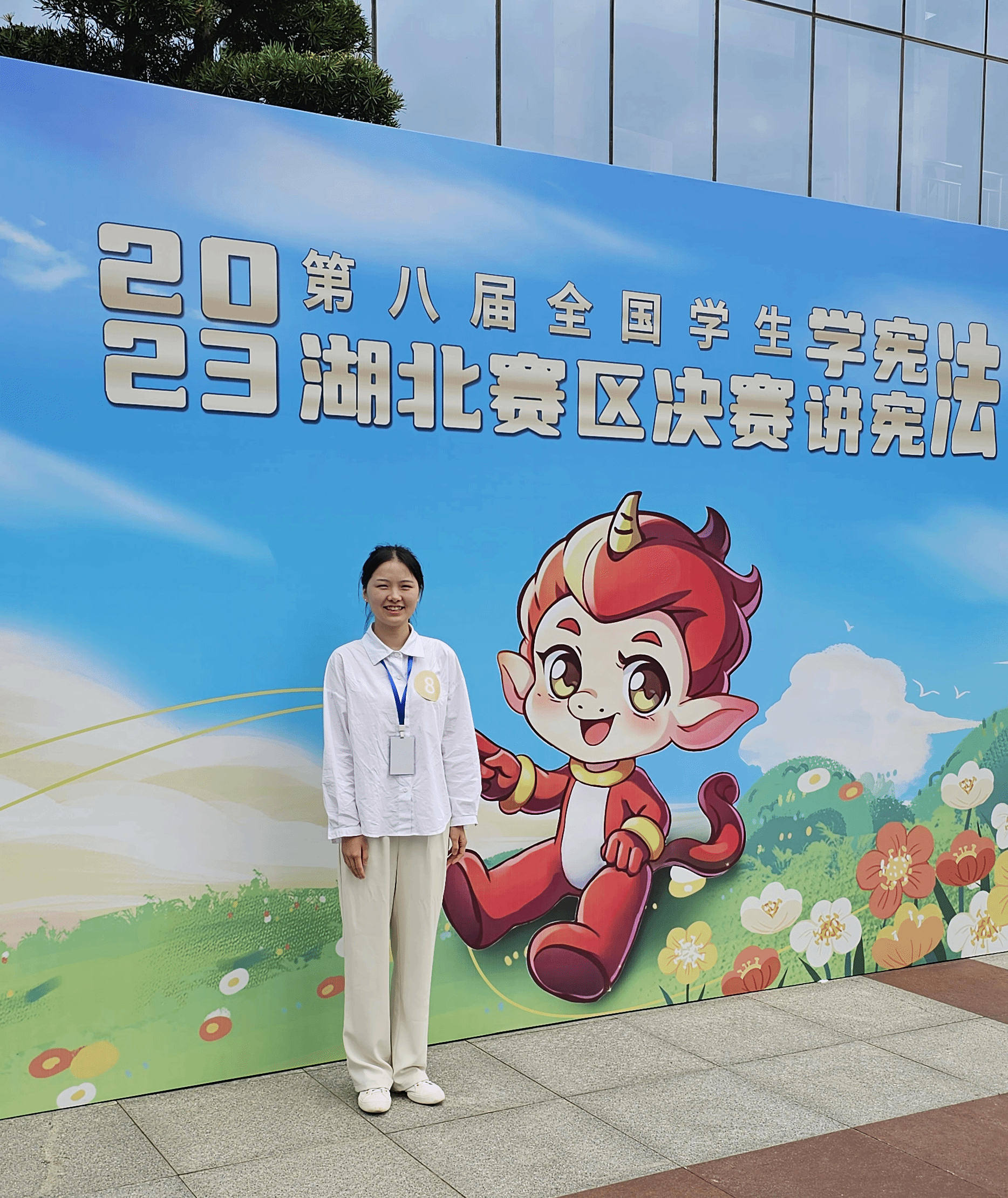 为了培养学生群体学宪法、讲宪法的意识,增加年轻一代对宪法的认同感和归属感,湖北省教育厅于2023年9月举办了全省第八届学生“学宪法 讲宪法”演讲比赛和素养竞赛活动选拔赛,选拔优秀选手组成湖北省代表队参加全国比赛,比赛面向湖北省内的小学、初中、高中、高校的全体学生。谢秋迪通过前期的资料提交、初试视频展示等考察,表现优异,顺利进入省赛竞争,代表我校参加此次比赛。